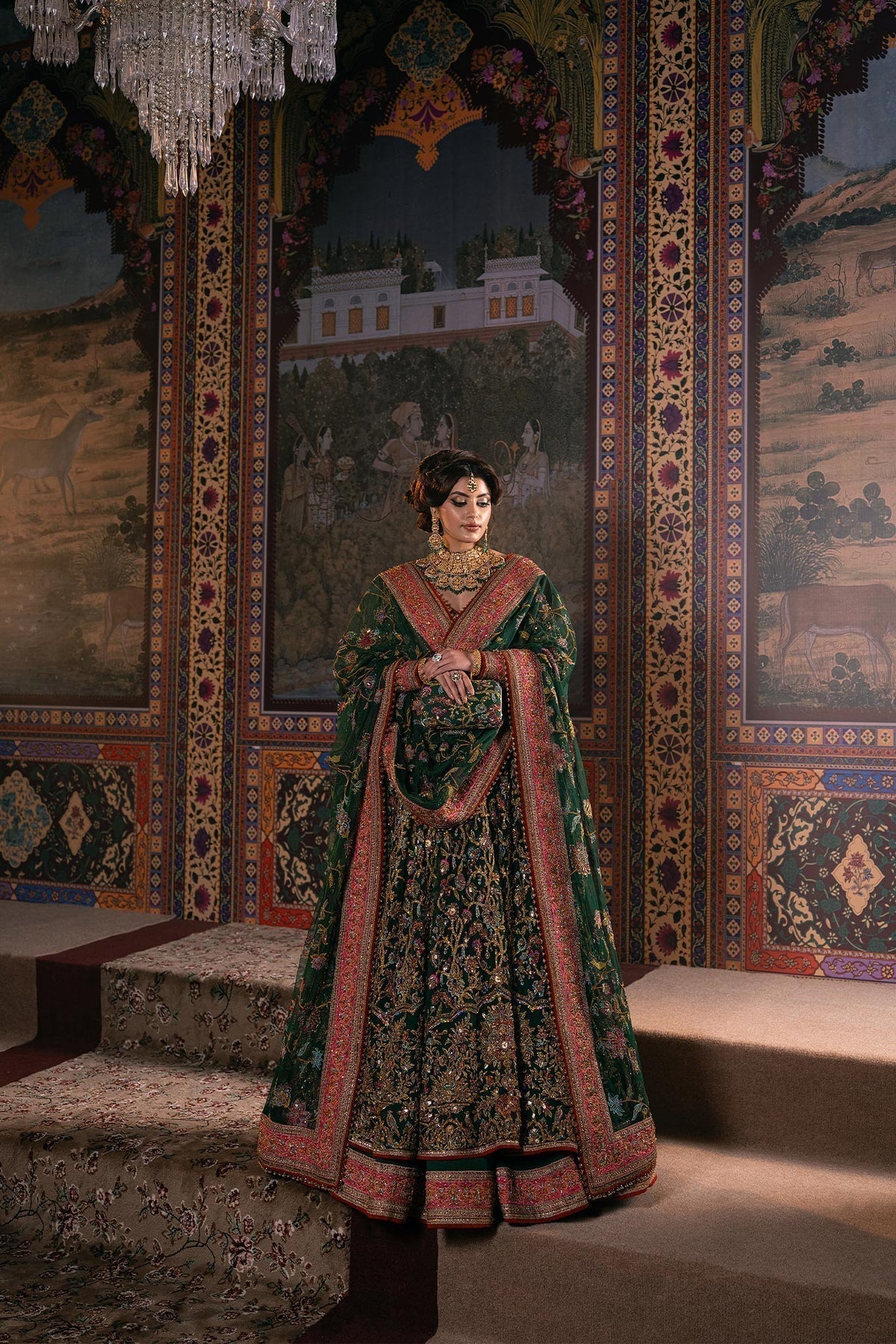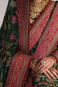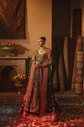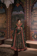 Envision yourself a captivating bride in this enchanting bottle green ensemble. The net pishwas boasts a base adorned with beautiful resham embroidery in a spectrum of colors, further accentuated by shimmering sequences. This captivating foundation reaches new heights with intricate zardozi work, adding a touch of regal elegance. The outfit flows seamlessly into a luxurious silk lehenga, finished with exquisite borders for a touch of sophistication. To complete the look, a delicate net dupatta reflects the pishwas embroidery, creating a cohesive and unforgettable statement for your special day.