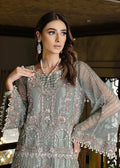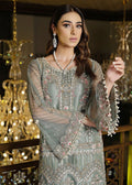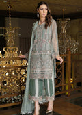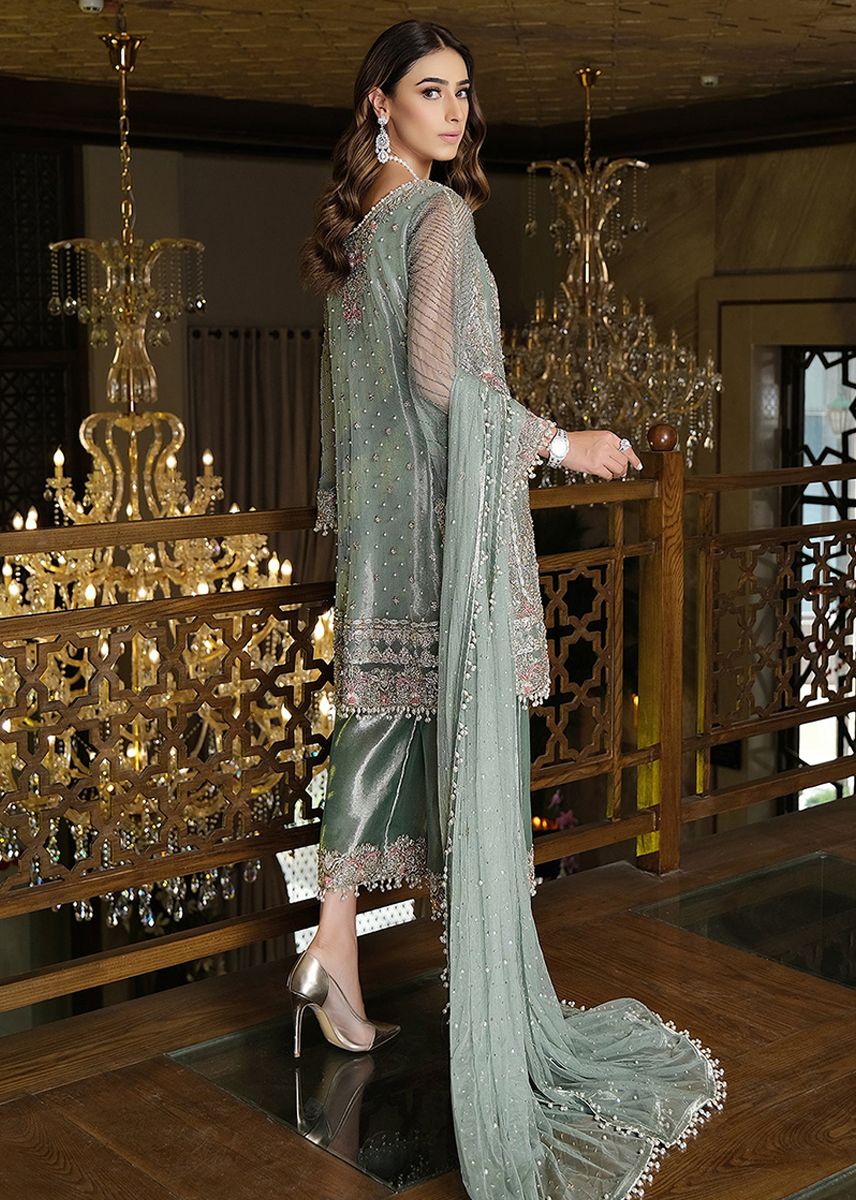Ice green attire embeded with intricate floral embellishments and alluring pearls on sleeves. A perfect pick for the festive and wedding season.